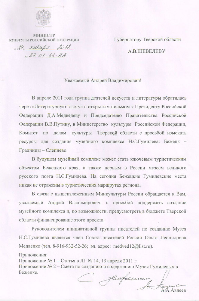 Руководитель группы писателей по созданию музея Н. С. Гумилёва в Бежецком крае, инициатор открытого письма президенту, журналист и писатель О. Л. Медведко не раз поднимала вопрос создания музея Гумилёва в прессе («ЛГ» от 1.09.2010 г., «НГ» от 25.08.2011 г.). На прошлой неделе (19 января) она побывала на приеме у министра культуры А. А. Авдеева и обсудила с ним возможности реализации этого проекта. В письме от 24 января 2012 года министр культуры А. А. Авдеев обратился к губернатору Тверской области А. В. Шевелеву с просьбой поддержать идею создания первого в России музея великого русского поэта Н. С. Гумилёва и по возможности предусмотреть в бюджете Тверской области финансирование этого проекта. Министр отметил, что в будущем музейный комплекс может стать ключевым туристическим объектом Бежецкого края. Он внес конкретные предложения по созданию музейного комплекса: подготовить туристическую карту Бежецкого района, связанную с памятными местами жизни семьи Гумилёвых, создать музей Николая и Льва Гумилёвых, сделать улицу Чудова заповедной и экскурсионной, т.к. на ней находятся Христорождественская церковь, прихожанами которой были все Гумилёвы, и гимназия (сейчас действует как школа), где учился Лев и читали лекции А. Ахматова и Н. Гумилёв; внести ограничения в градостроительную документацию Бежецка, запрещающие строительство современных домов по улице Чудова; Слепнево, где раньше была усадьба Гумилёвых, должно стать особой заповедной территорией, где один или два раза в год можно проводить праздники поэзии (как в блоковском Шахматове), но обязательно сберечь это место в его природной первозданности для будущих поколений.