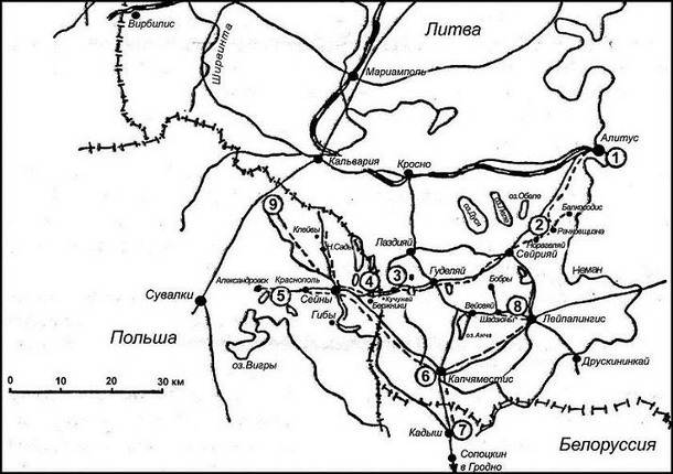 1 — Олита, куда прибыла дивизия после переброски из Польши (начало главы VII); 2 — расположение Уланского полка в Рачковщизне и ведение разведки на Серее (глава VII); 3 — наступление через Серее, Гуделе и ночное столкновение с немцами за Коцюнами у Голны-Вольмеры (глава VIII); 4 — дальнейшее наступление, бой в районе Бержников (глава IX); 5 — третий день наступления, разведка и бои в районе Краснополя (начало главы X); 6 — отход от Сейн на Копциово (середина главы X); 7 — бивак в Кадыше (конец главы X); 8 — расположение улан в Лейпунах и дальний разъезд с Чичаговым на Шадзюны — Бобры, бивак в Салтанишках (начало и середина главы XI); 9 — наступление на дорогу Сувалки — Кальвария, разъезд с Кропоткиным на фронте Сейны — Гибы, болезнь и эвакуация через Кальварию и Ковно в Петроград на лечение (конец главы XI).
