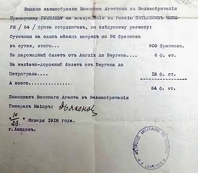 Документ о выдаче прапорщику Гумилеву денежной суммы на возвращение в Россию