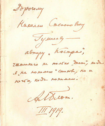 Автограф Александра Блока Николаю Гумилёву на мусагетовском собрании сочинений