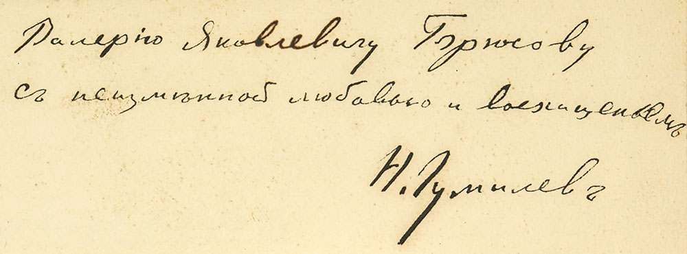 [Экземпляр с автографом Валерию Брюсову]. Гумилев, Н. Чужое небо. Третья книга стихов. СПб.: Издание «Аполлон», 1912. 126 с. 22,5 х 17 см. Во владельческом полукожаном переплете эпохи. Издательская иллюстрированной обложка сохранена. На первом пустом листе: «Валерию Яковлевичу Брюсову с неизменной любовью и восхищеньем Н. Гумилев».